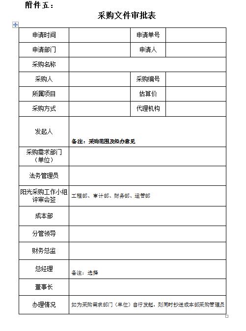 3.工作流程:需求部門(單位)提報《采購申請表》,按規定程序審批通過后,由成本部委托招標代理機構具體實施。