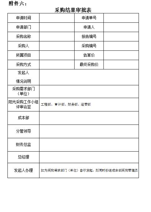 8.采購評審小組形成采購報告,由成本部或需求部門(單位)根據需要發起《采購結果審批表》,按照評審結果確定成交供應商;